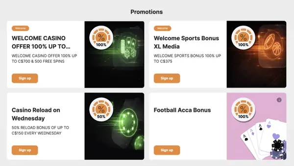 Nous proposons des promotions rĂ©guliĂšres adaptĂ©es Ă diffĂ©rents styles de jeu. Monday Free Spins offre 25 Tours Gratuits sur une machine Ă sous mystĂšre, et Wednesday Reload Bonus ajoute un bonus de rechargement de 25% jusquâĂ 150 CAD. Les joueurs de sport peuvent utiliser la promo Weekend Winner, qui attribue un pari gratuit de 15 CAD sur les Ă©vĂ©nements du week-end.